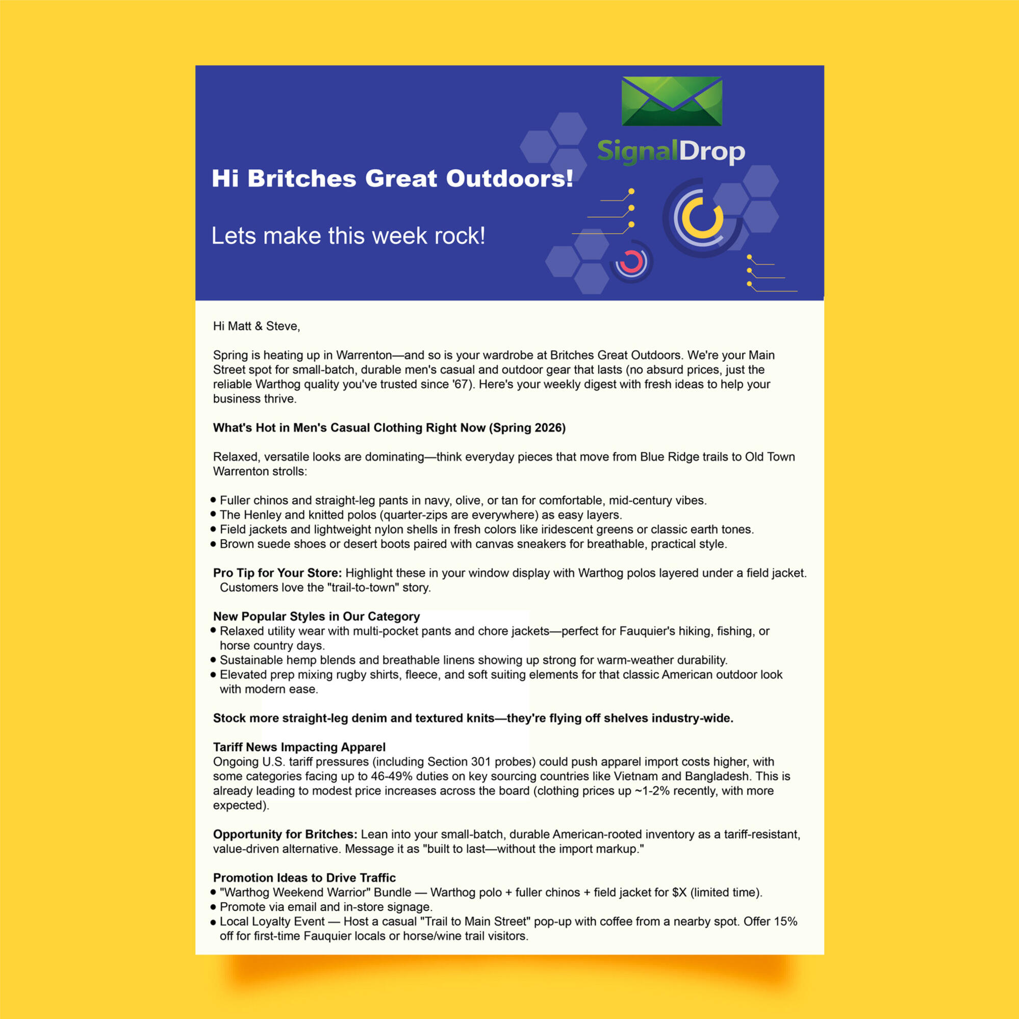 SparkDrop delivers Ai-powered intelligence tailored for your individual business straight to your inbox every 2 weeks — actionable steps you can realistically execute, trends, and key intelligence curated by your own dedicated team of expert marketing, business and trend advisors. All for $79/month.